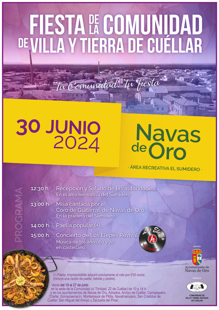 FIESTA DE LA COMUNIDAD DE VILLA Y TIERRA DE CUÉLLAR 2024 Fiesta de la Comunidad el 30 de junio de 2024 en Navas de Oro. Área recreativa el Sumidero. Documentos Fiesta comunidad villa y tierra 2024.pdf (pdf 8 MB)